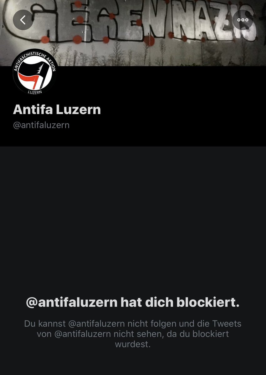 Direkt nach diesem Tweet hat mich die @antifaluzern geblockt. Schade aber auch! Eine demokratische Debatte ist dort wohl unerwünscht.pic.twitter.com/yh1ZLpHl08