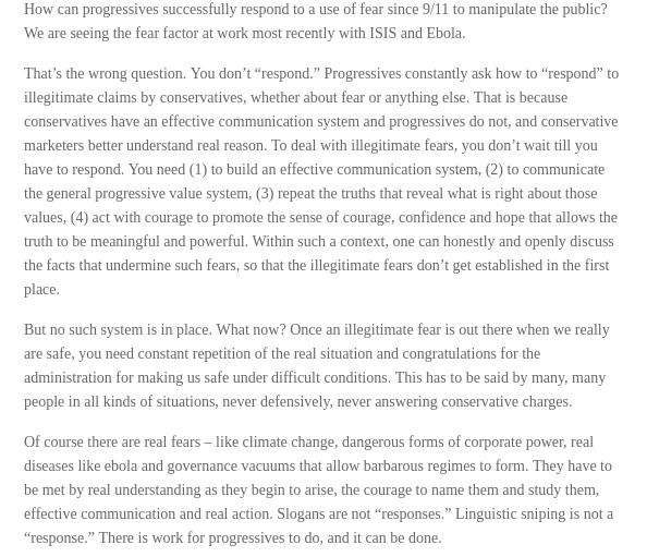 Dieses Interview ist im Video als Quelle angegeben. Bzgl. Umgang mit unhaltbaren Behauptungen, die darauf abzielen irrationale Ängste zu wecken, wird folgendes empfohlen: https://georgelakoff.com/2014/11/29/george-lakoff-in-politics-progressives-need-to-frame-their-values/ …pic.twitter.com/s5SGjs1wgF