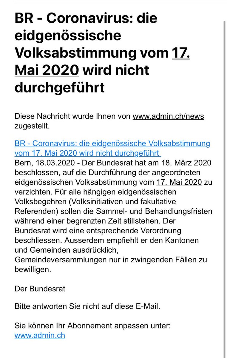 Die Fristen für Volksinitiativen und Referenden werden verlängert! Bravo und danke. 👍 Auch die Abstimmung wird verschoben. #Volksrechte #covid19 #coronaviruspic.twitter.com/22ZpTEnXnb
