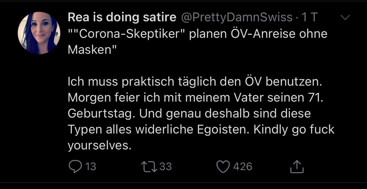 Diejenigen, die knallharte Massnahmen gegen Anti-Coronapolitik-Demos fordern, deren Teilnehmer als #covidioten verspotten & jene, die gleichzeitig dem @klimastreik (wie auch #BLM) applaudieren und diese verteidigen (Verfassung!!!) sind dieselben - oder? Heuchlerische Doppelmoral.https://twitter.com/themattmueller_/status/1307998350109745158 …