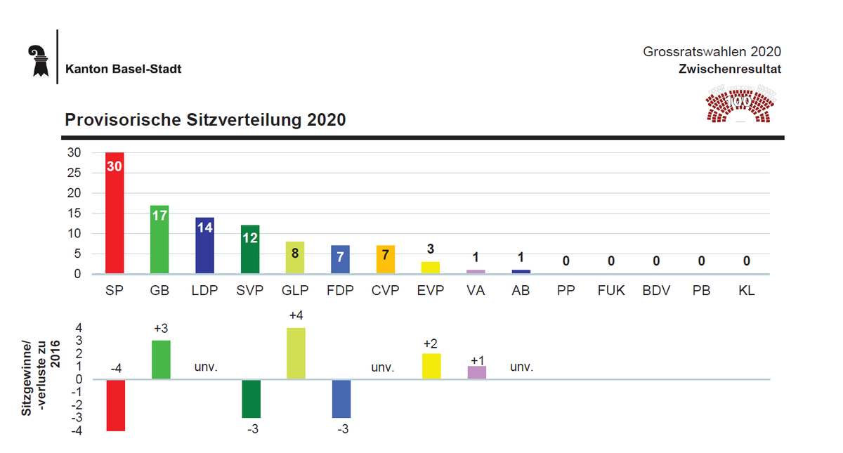 Grossratswahlen 2020 Basel-Stadt - Zwischenresultat: SP 30 (-4) GB 17 (+3) LDP 14 (0) SVP 12 (-3) GLP 8 (+4) FDP 7 (-3) CVP 7 (0) EVP 3 (+2) VA 1 (+1) AB 1 (0) Mehr dazu: http://www.wahlen.bs.ch  #WahlBS20 pic.twitter.com/VbKCnwN92m