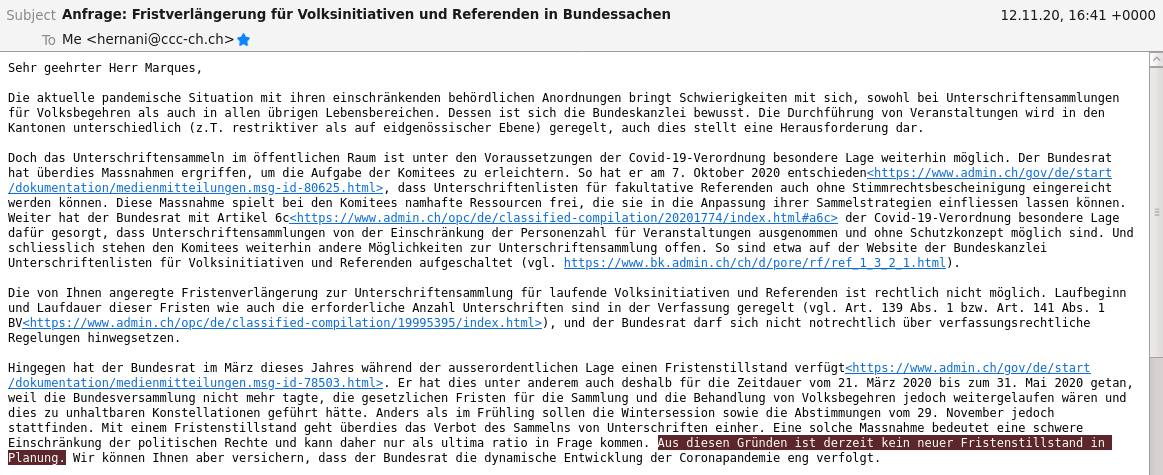 📢 Antwort der Bundeskanzlei punkto Fristverlängerung Volksinitiativen / Referenden in der #COVID19-Pandemie eingetroffen: "[...] Es ist derzeit kein neuer Fristenstillstand in Planung." 😭 https://twitter.com/vecirex/status/1323152343798632448 … pic.twitter.com/Htanox8emC
