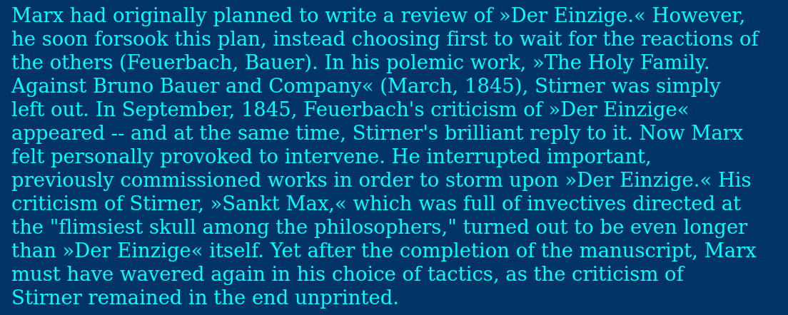 Die Begeisterung Karl Marx' für das Werk "Der Einzige und sein Eigentum" hielt sich übrigens in Grenzen - Max Stirner räumt da nämlich mit Liberalismus, (kollektivistischem) Sozialismus ("Lumpengesellschaft" usw.) und einfach allem auf.