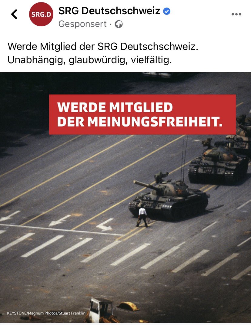 Mit dieser Werbung der ⁦⁦@SRGSSR⁩ habe ich Mühe. #Meinungsfreiheit kann man nicht abomässig lösen. Der Slogan,man sei Mitglied der Meinungsfreiheit,wenn man #SRG-Mitglied ist,ist fast pervers. Meinungsfreiheit steht und fällt mit uns selber. Sie ist nie organisiert.⁩pic.twitter.com/TrzItTJmlH