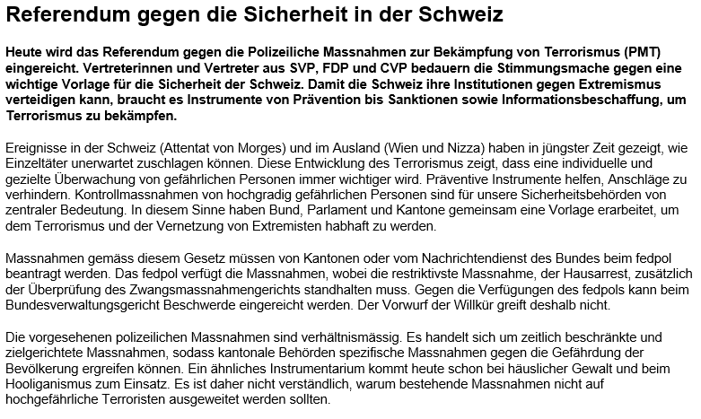 VertreterInnen von @SVPch @FDP_Liberalen @CVP_PDC bedauern die Stimmungsmache gegen eine wichtige Vorlage. Damit die 🇨🇭 ihre Institutionen gegen Terrorismus verteidigen kann, braucht es Instrumente von Prävention bis Sanktionen sowie Informationsbeschaffung. #PMT #abst21pic.twitter.com/kTmDHONSHO