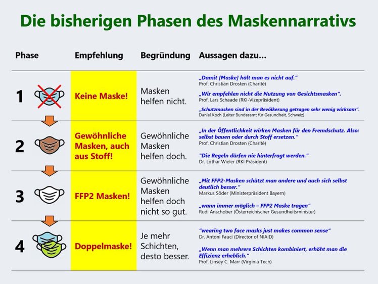 Typische Methode der „Massnahmenbefürworter“: Ständig ändernde Story. Beklatscht durch unfähige, willfährige Medien... Beispiel: Masken. Wissenschaftliche Realität übrigens: Keine überzeugenden Beweise, dass sie irgendetwas bringen.pic.twitter.com/bFbCpY3L1L
