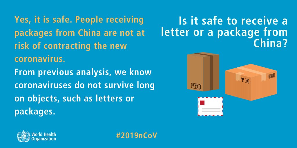 @WHO * It's safe to receive package from China * no evidence you can get it from your pets (but protect yourself still from bacteria) * Flu Vaccines do not provide protection as nCov needs a vaccine on its own * saline rinse has no significant effect Stay healthy#2019nCoVpic.twitter.com/eylACWv1f4