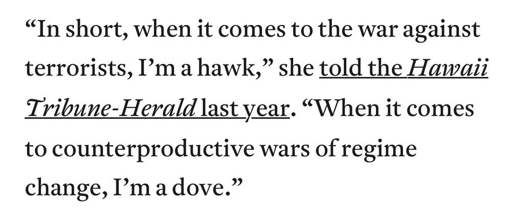 This is incoherent insofar as there is significant overlap between these two categories! The fact that she has any reputation at all as being “anti-war” is steaming hot bunkpic.twitter.com/1uiGdWfyM4