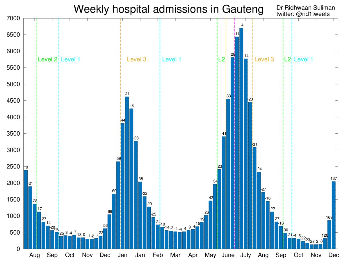 Finally, a look at hospitalisations in Gauteng? New admissions doubling ~ every 5 days, and up to 31% of previous peak levels Note: hospitalisations lag cases by 1-3 weeks, and with reporting delays need to wait a week to understand actual hospital admissions for previous week pic.twitter.com/YiokSuTKfZ