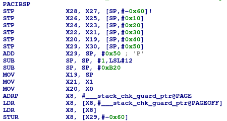 Looking through the dyld_shared_cache, we found many examples of this. It's really weird. The assembly looks a bit garbled and the stack cookie is inside the buffer. The problem only seems to occur in ARM64. (2/10)pic.twitter.com/JrnQaiB8Hv