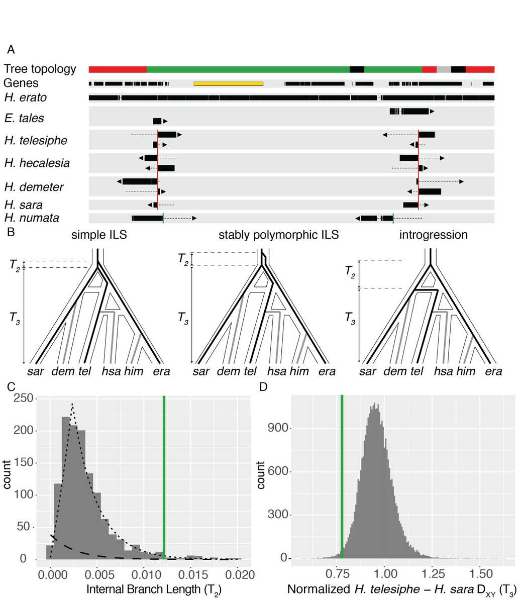 We combined this method with our de novo assemblies to show that most discordant topologies in the genome arose through introgression, and to identify a convergent, introgressed inversion that captures a color pattern gene! 4/pic.twitter.com/XamKR7LQnh