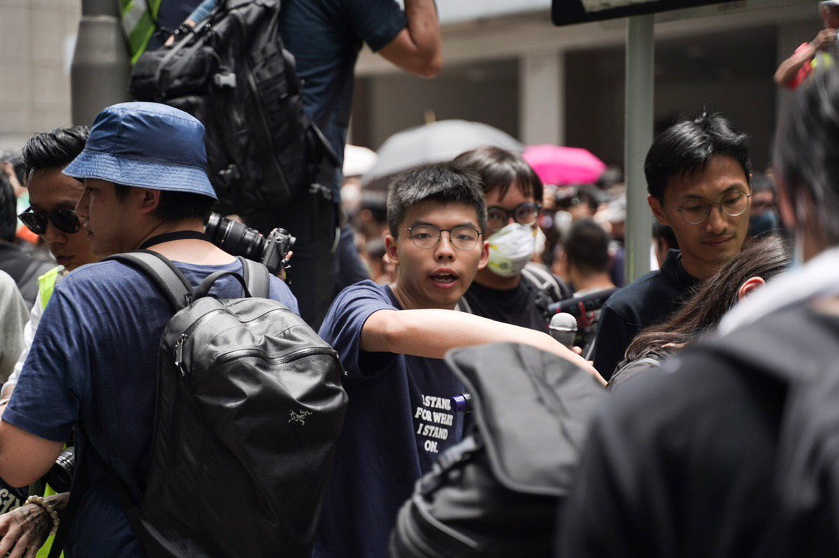 Joshua Wong is among those speaking to crowds outside police HQ. They want to go inside to submit a complaint about police conduct during a demonstration last weekpic.twitter.com/ISgo2LyBK3
