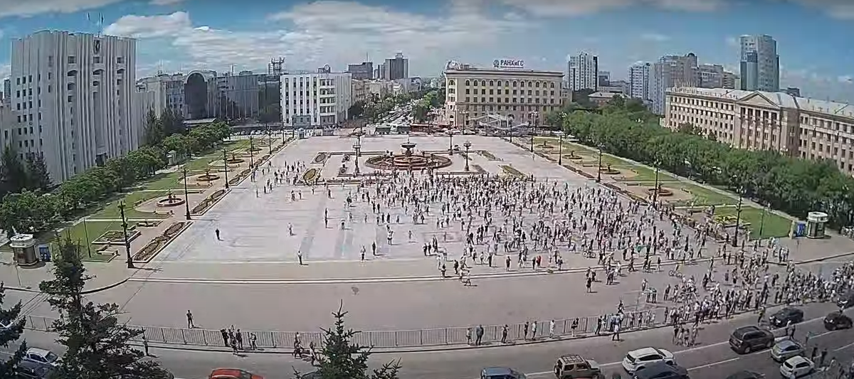 Люди обогнули центр и возвращаются к площади Ленина. Сложно подсчитать, сколько людей сегодня гуляют по Хабаровску — не видно ни начала, ни конца толпы. Не менее 5 тысяч точно, а скорее всего больше.pic.twitter.com/f7sgxPzmB7
