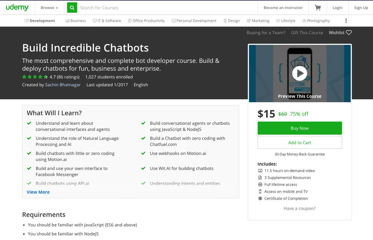 @Udemy's "Build Incredible Chatbots" course: https://www.udemy.com/build-incredible-chatbots/ …pic.twitter.com/x9M5FUUaoO