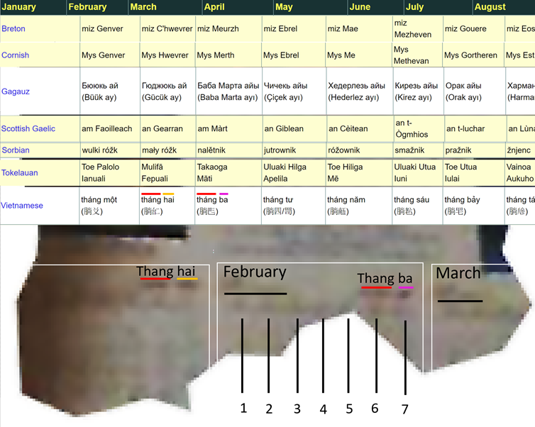 First thoughts: On the calendar, each month seems to have 2 titles. The ones on the right are formed by two separate words. After checking different languages- Vietnamese matches largely.