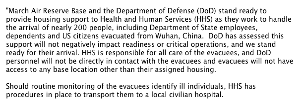 DoD spox: nearly 200 people — including State Department employees and family members — are being evacuated from Wuhan to March Air Reserve Base in California.pic.twitter.com/OkFq8cv5hk