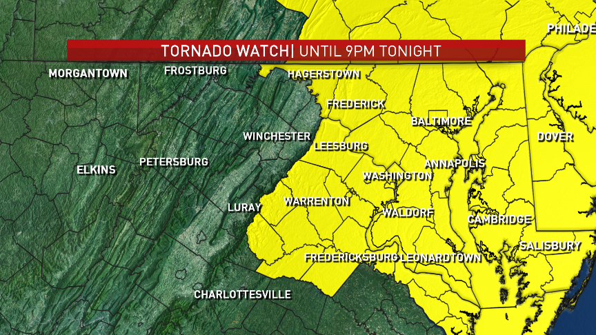 Weather Alert: A tornado watch is in effect for D.C. and many counties in Maryland and Northern Virginia. Full forecast
