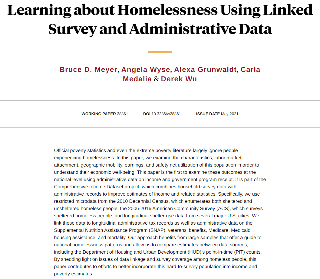 An examination of the characteristics, labor market attachment, geographic mobility, earnings, and safety net utilization of the US homeless population, from Bruce D. Meyer, Angela Wyse, Alexa Grunwaldt, Carla Medalia, and Derek Wu https://nber.org/papers/w28861 pic.twitter.com/y2qeIGKQj8