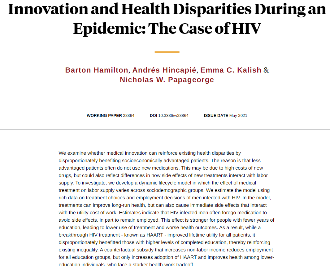 Medical innovation can reinforce existing inequality by disproportionately benefiting advantaged groups that are better able to use pricey treatments with side effects that interfere with employment, from Hamilton, Hincapié, Kalish, and