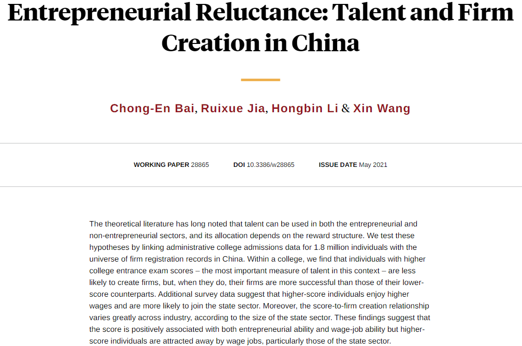 In China, the college entrance exam score is predictive for both firm success and wage-job success in the future, yet higher-score individuals are less likely to create firms, from Chong-En Bai, Ruixue Jia, Hongbin Li, and Xin Wang https://nber.org/papers/w28865 pic.twitter.com/JAFcD77B6N