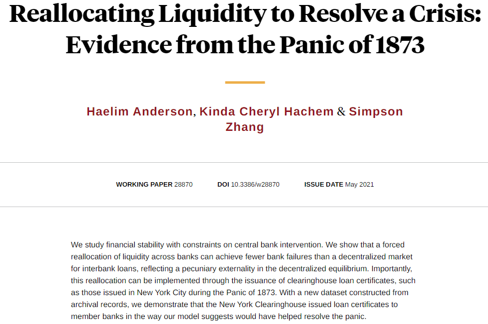 Clearinghouse loan certificates, similar to those issued in New York City during the Panic of 1873, can help resolve financial crises with less central bank intervention, from Haelim Anderson, Kinda Cheryl Hachem, and Simpson Zhang https://nber.org/papers/w28870 pic.twitter.com/RmiW3TN5s1