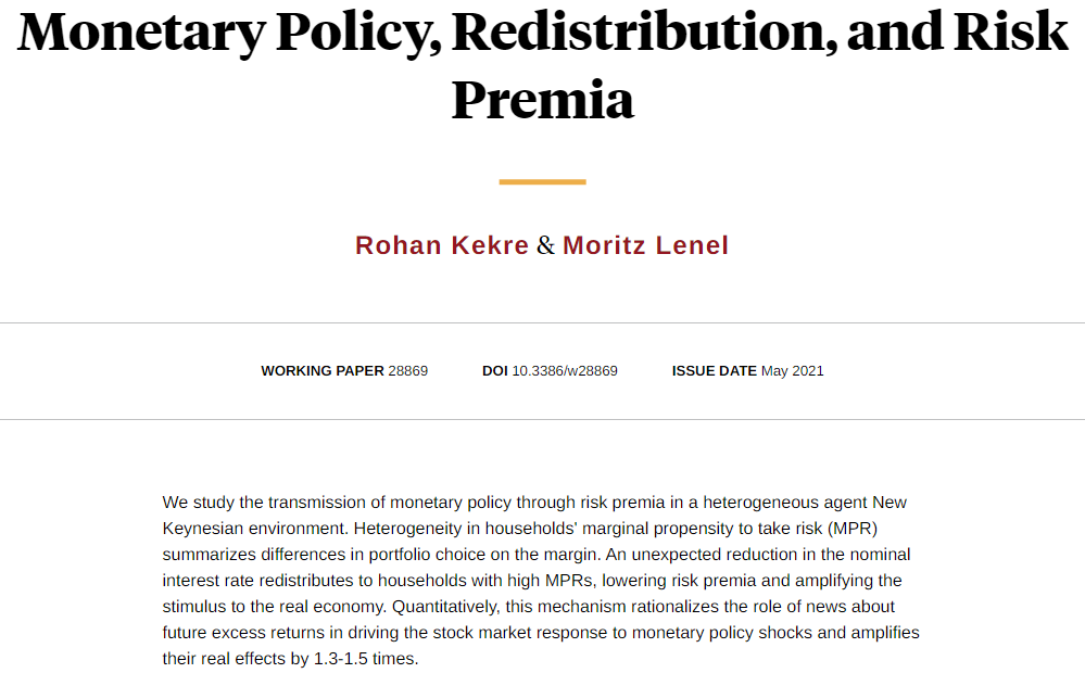By redistributing wealth to those with a high marginal propensity to take risk, expansionary monetary policy lowers risk premia and stimulates the real economy, from Rohan Kekre and Moritz Lenel https://nber.org/papers/w28869 pic.twitter.com/JG0nTgSQu5