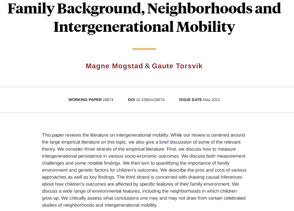 A review of the literature on intergenerational mobility, from Magne Mogstad and Gaute Torsvik https://nber.org/papers/w28874 pic.twitter.com/JdmY6BcymD