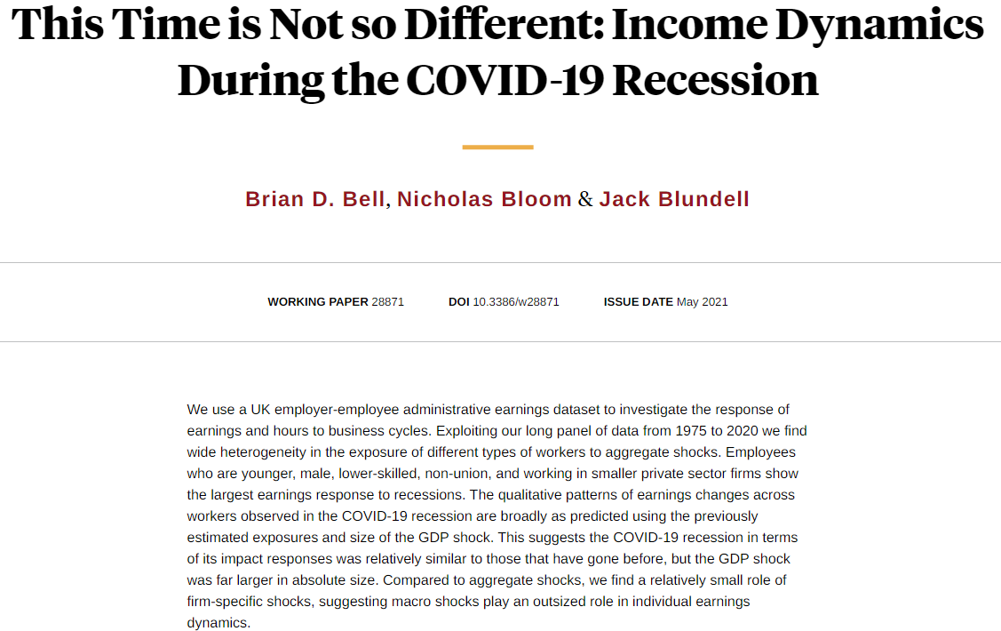 Earnings changes of UK workers in the COVID-19 recession are broadly similar to changes in previous recessions, but the GDP shock was far larger in absolute size, from Brian D. Bell, Nicholas Bloom, and