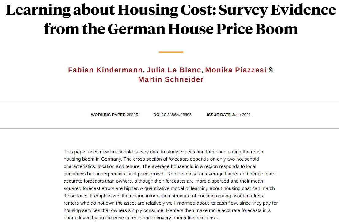 Analysis of expectation formation during the recent housing boom in Germany. The cross section of forecasts depends on only two household characteristics: location and tenure, from Fabian Kindermann, Julia Le Blanc, Monika Piazzesi, and Martin Schneider https://nber.org/papers/w28895 pic.twitter.com/pIWfx1VMC7
