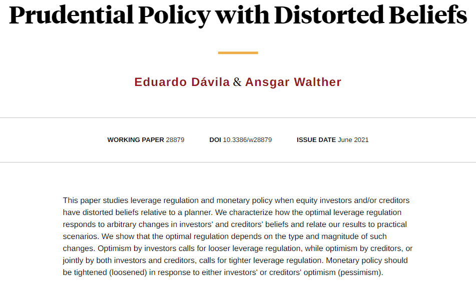 How to think about leverage regulation and monetary policy when equity investors and/or creditors have distorted beliefs relative to the planner, from Eduardo Dávila and