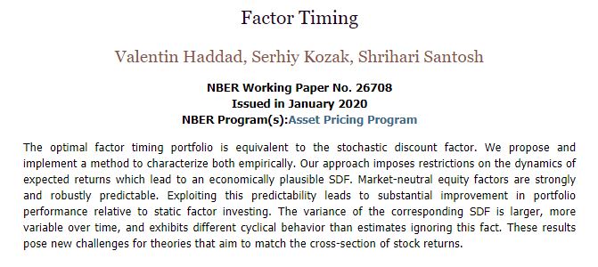 A new approach to factor timing generates superior investment performance and has important implications for asset pricing models, from Valentin Haddad, Serhiy Kozak, and Shrihari Santosh https://www.nber.org/papers/w26708 pic.twitter.com/jDvcZuvR8s