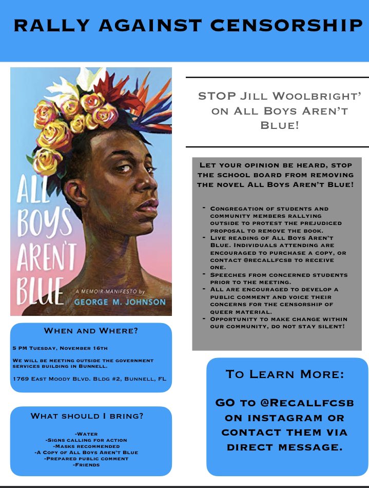 This comes after a school board member in Flagler County, Florida filed a criminal report (!) of @iamgmjohnson’s book, All Boys Aren’t Blue. https://www.wfla.com/news/florida/florida-school-board-member-files-criminal-report-over-lgbtq-themed-book/ …https://twitter.com/Jack_Petocz/status/1459408201208631299 …