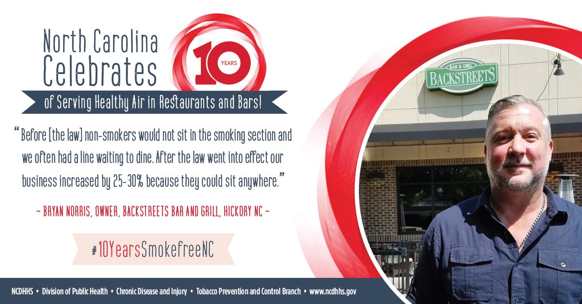 #smokefree section? Bryan Norris, owner of Backstreets Bar and Grill in Hickory, sure does. In 2020 we#celebrate#10yearssmokefreenc.@NCRLA@NCAlliance4Hlthpic.twitter.com/2f7ZdpSmxL