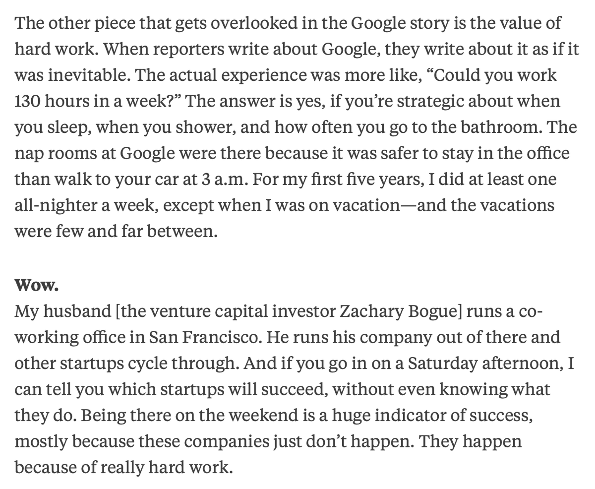 Whenever I confuse myself into thinking that advocates of 80-hour work weeks are as extreme as it gets, I think of when Marissa Mayer advocated 130-hour weeks, and declared that startups that don't work weekends are bound to fail
