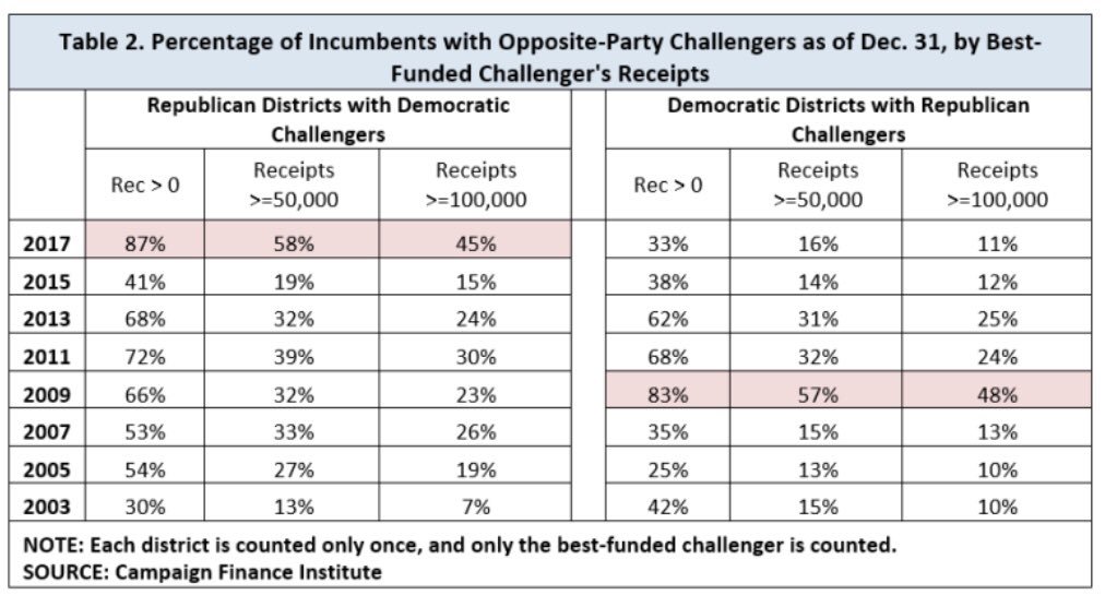45% of Rep House districts have Dem challenger who raised >$100K year before election, similar to Rep candidate strength in 2009; concentrated in swing districts; but unprecedented early candidates were product of resistance coming earlier than Tea Party https://www.brookings.edu/blog/fixgov/2018/02/26/is-a-wave-rolling-in-for-house-democrats/ …pic.twitter.com/sCyz08xHwx