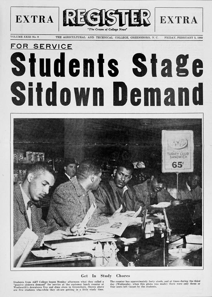#OnThisDay in 1960, the Greensboro Four made the headline, "Students Stage Sitdown Demand," of the student newspaper of North Carolina A&T State University in Greensboro, North Carolina! #BlackHistoryMonthpic.twitter.com/R5coFWN6QO