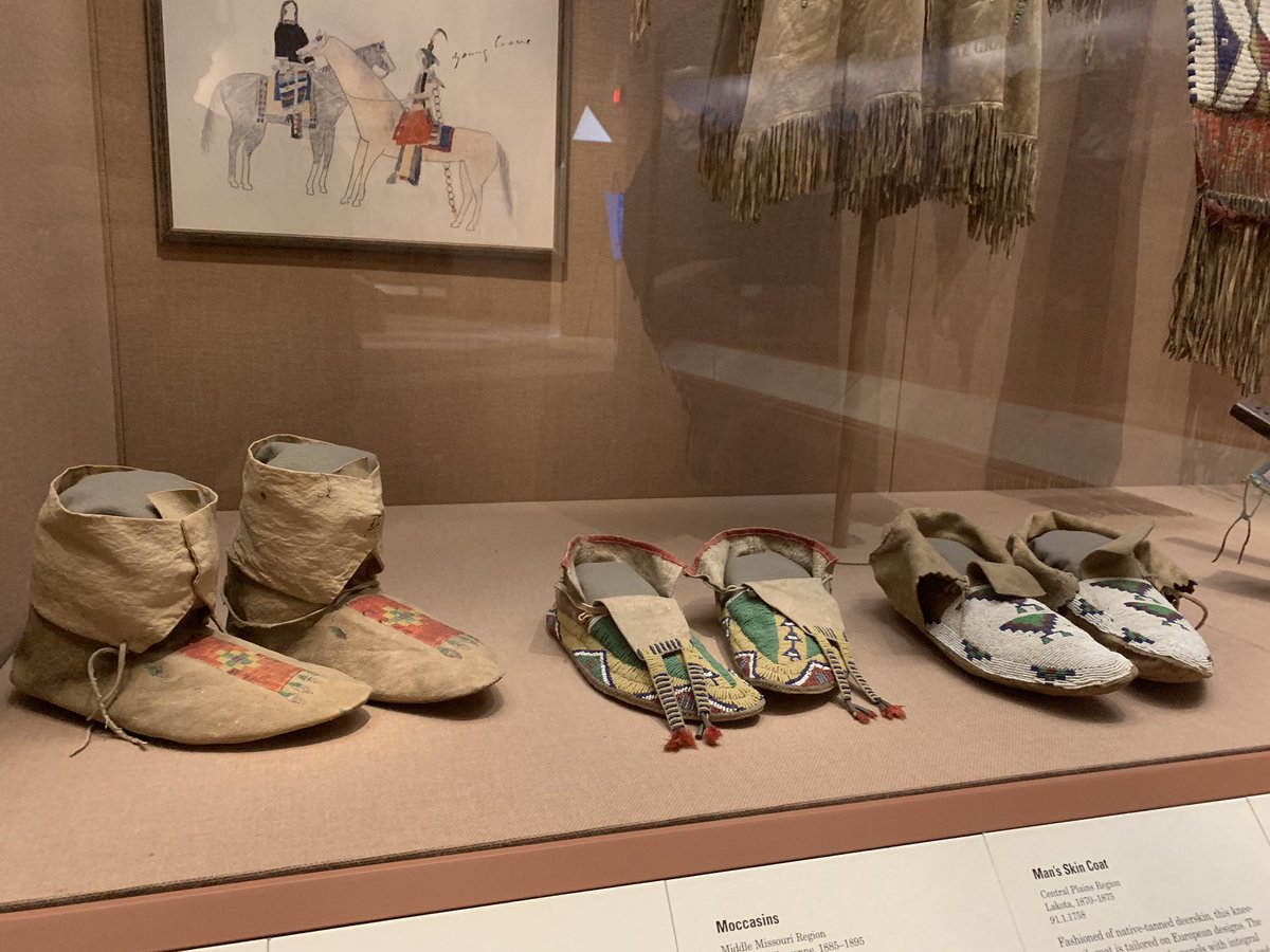 Morning! Admiring the craftsmanship of these Lakota or Cheyenne moccasins from 1885-1895. They have hard rawhide soles and native-tanned animal hide uppers. And very cool “buffalo track” bead design.