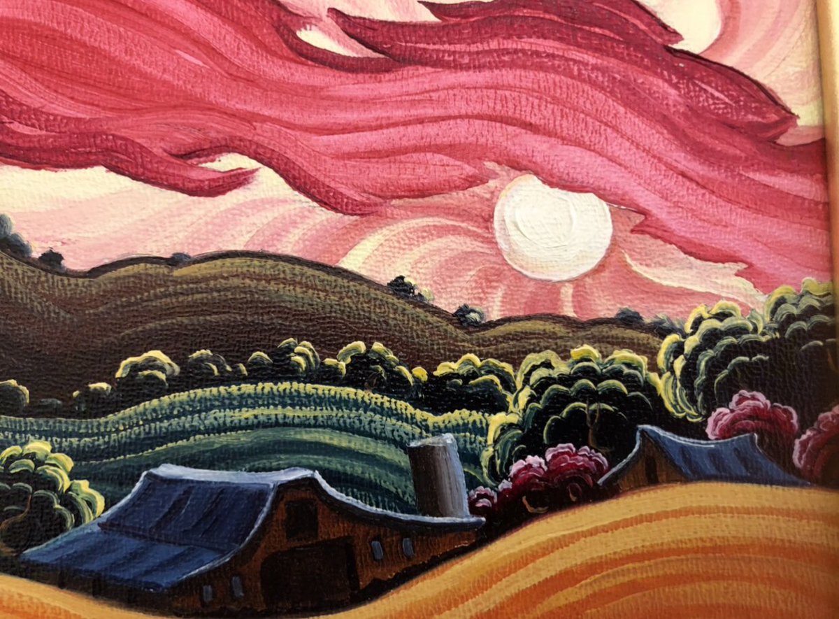 Morning! Nothing like a sunrise in Small Works, Great Wonders. This is “Chasing the Dawn” by Kim Wiggins. I’m not gonna chase it. Just gonna drink my Arbuckles and enjoy it.