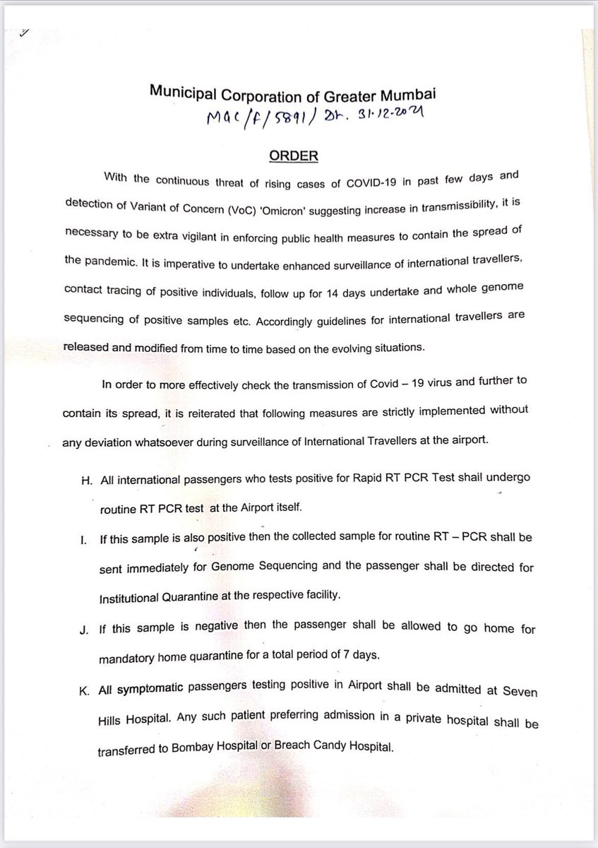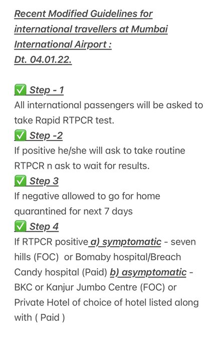 #Mumbai International Airport from abroad. All international passengers to undergo rapid RT-PCR test. If negative, allowed to leave and stay under 7-day home quarantine. Those found positive to undergo institutional quarantine. (ANI)pic.twitter.com/X4iQESVb3b
