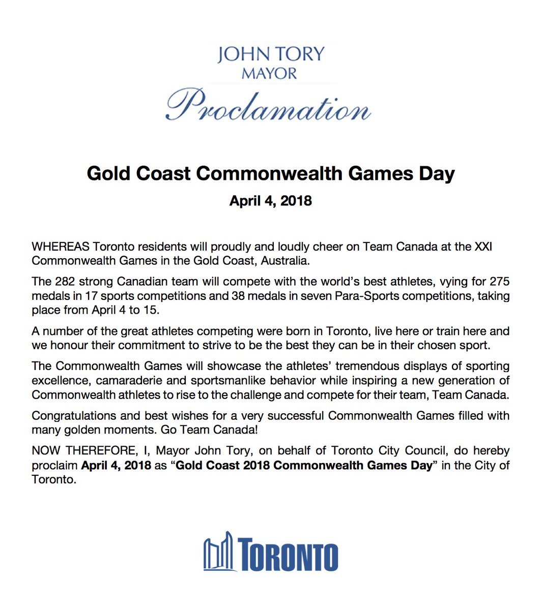 To mark the XXI Commonwealth Games, the Flag of the Commonwealth Games Association of Canada will fly over City Hall. Good luck to all our athletes in Australia!