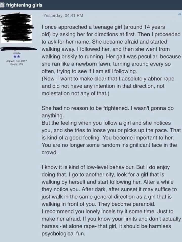 Ladies be so very very careful when out alone, day or night. This found on a InCel Website. (Probably Reddit)pic.twitter.com/URVb3JErCv