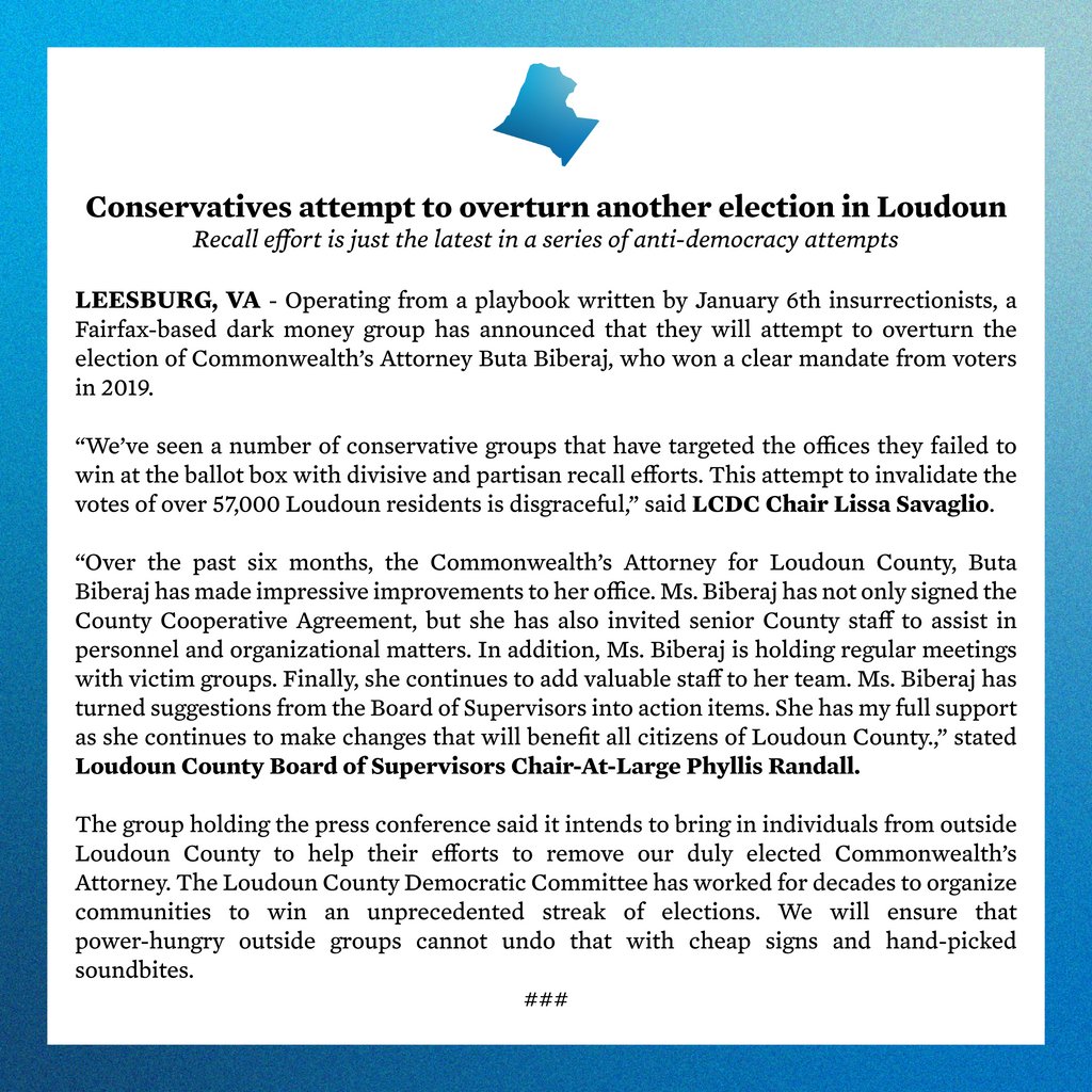 Member Tung needs to stop normalizing frivolous recalls. Dems should not be colluding w/Republicans taking a page out of the Jan. 6 playbook & using recalls to undermine election results! This is the kind of resolution DCCC members should be championing.https://mobile.twitter.com/LoudounDems/status/1413312098784919558 …