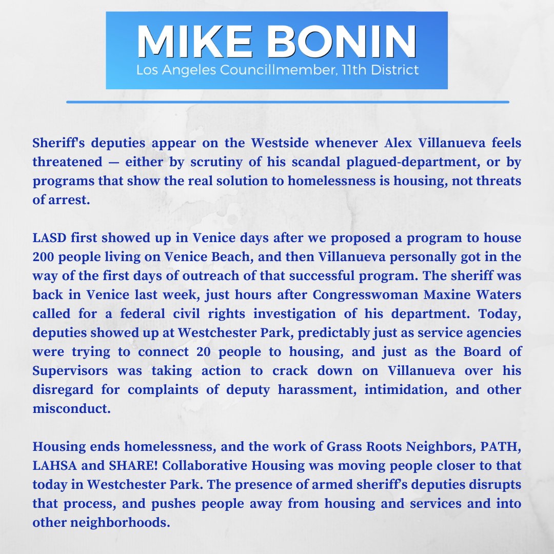 LASD pops up whenever the sheriff feels threatened - by scrutiny of his scandal plagued-department, or by programs showing the solution to homelessness is housing, not threats of arrest. Thank you to the agencies & people who do real outreach, casework & housing placement. pic.twitter.com/PDbCWdXK5i