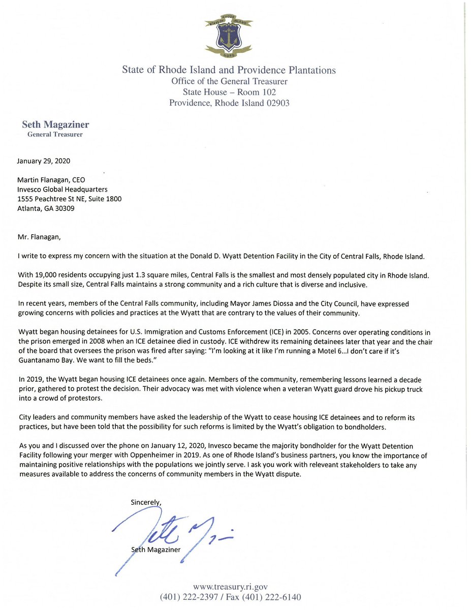 @SethMagaziner wrote this letter to the CEO of@InvescoUS, the top investor in the Wyatt Detention Center, urging them to listen to the community's concerns about the facility.#ShutDownWyatt#AbolishICEpic.twitter.com/hHFlTZM6c6