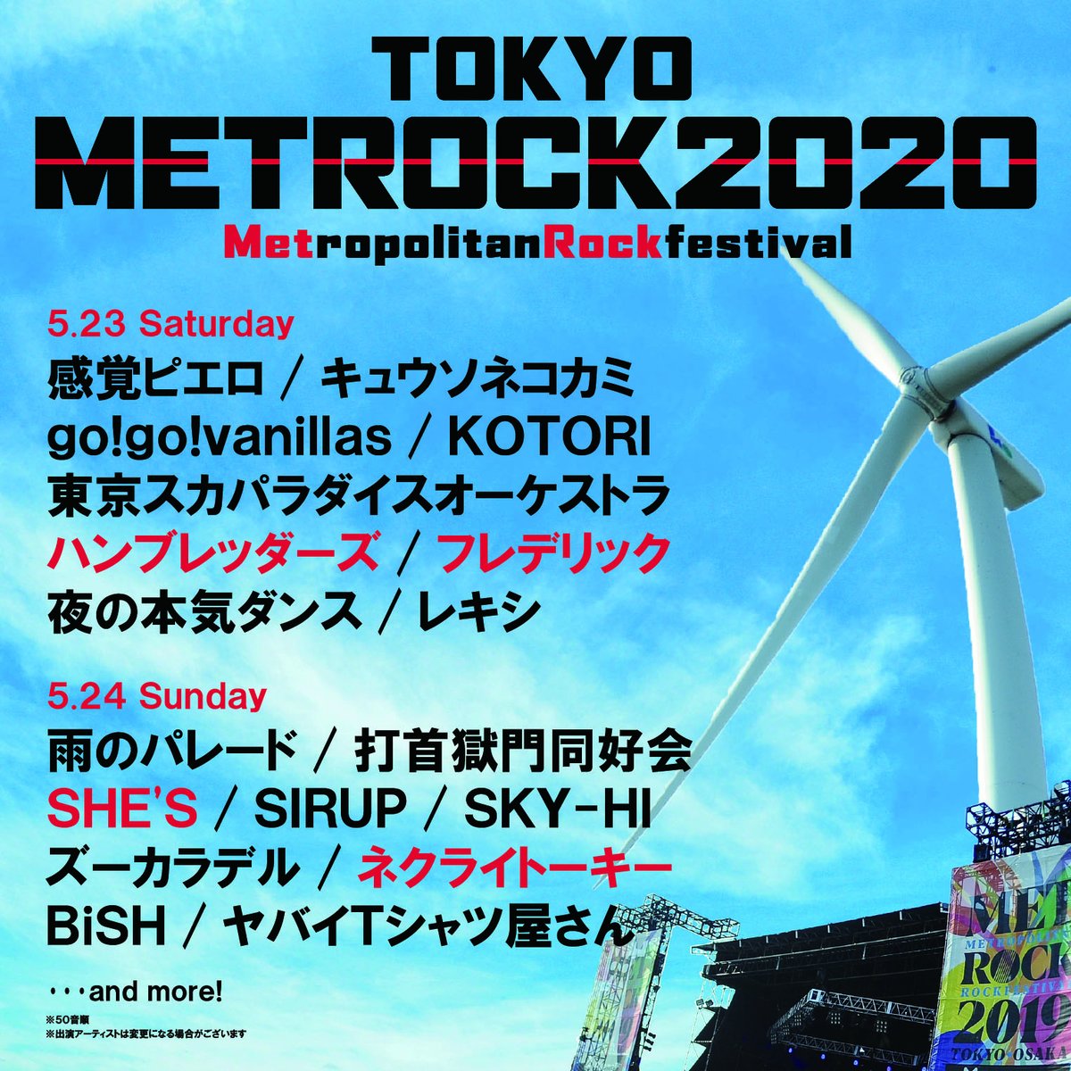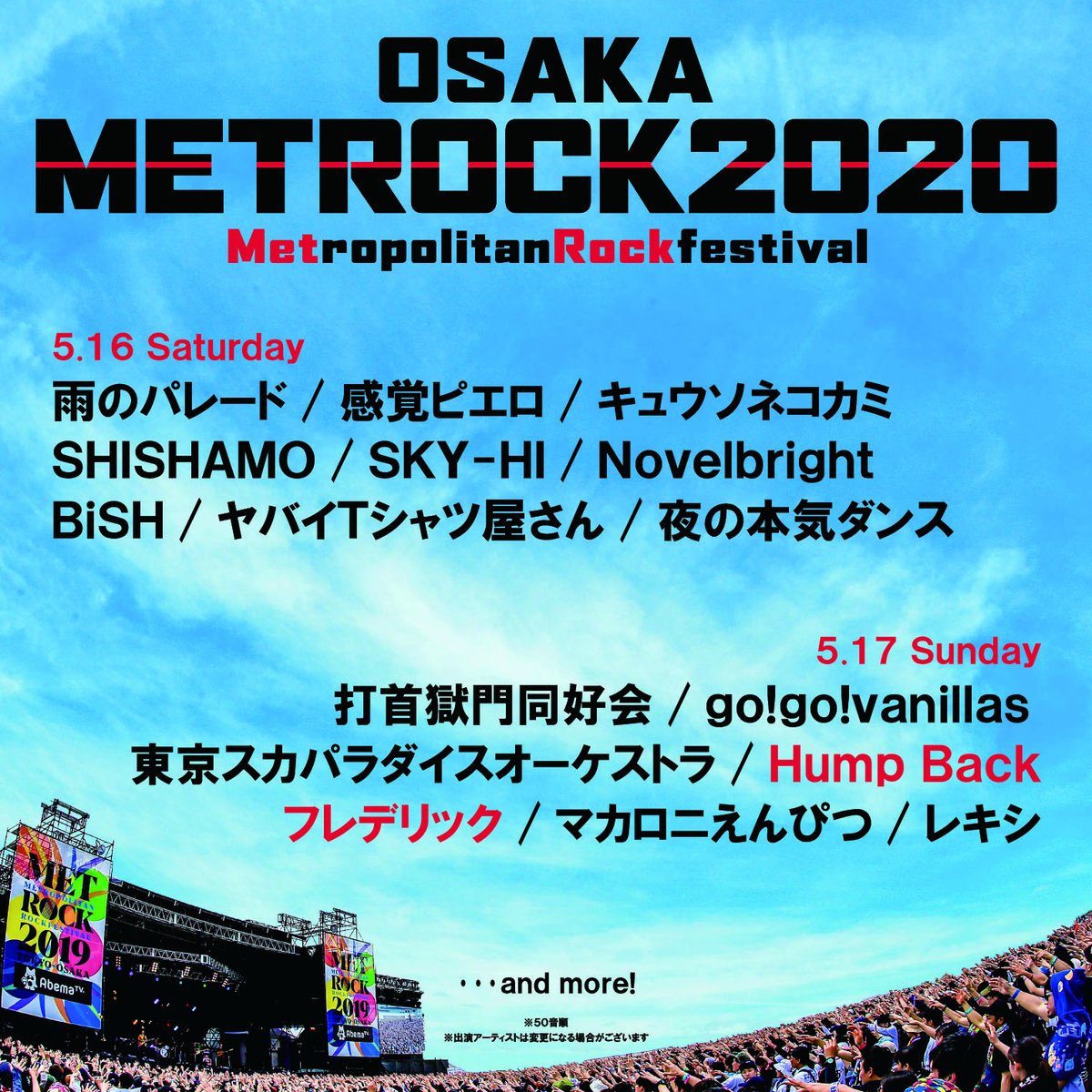 5/16(土)・17(日)大阪府堺市 海とのふれあい広場特設会場で開催される 【METROPOLITAN ROCK FESTIVAL 2020】の日割りが解禁されました