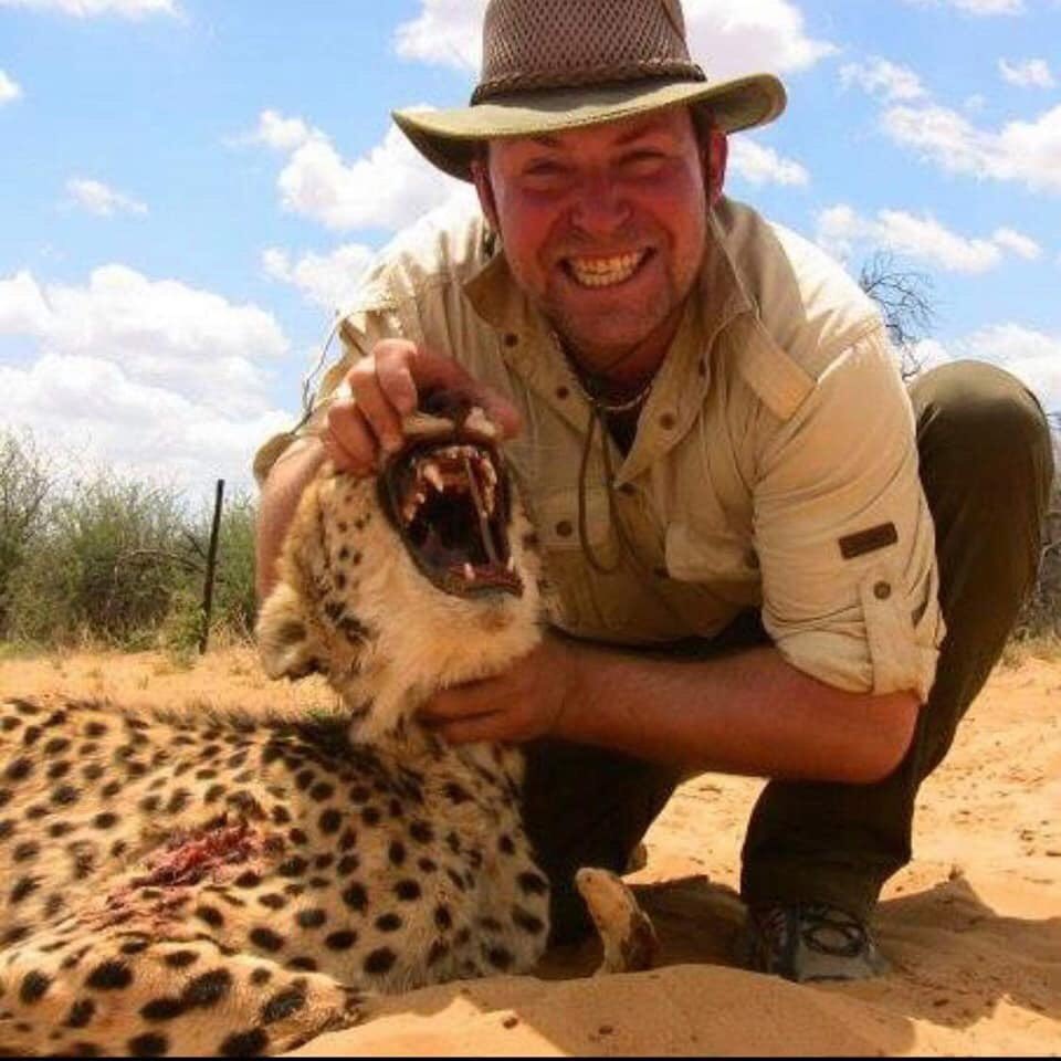 The obnoxious grin of a Cheetah killer who thinks he’s a hero. He didn’t kill the animal with his bare hands. He used a high powered rifle. From the Nordic Safari Club Chapter, he delights in showing the cheetahs teeth? Cheetahs are predators you’re a bully.