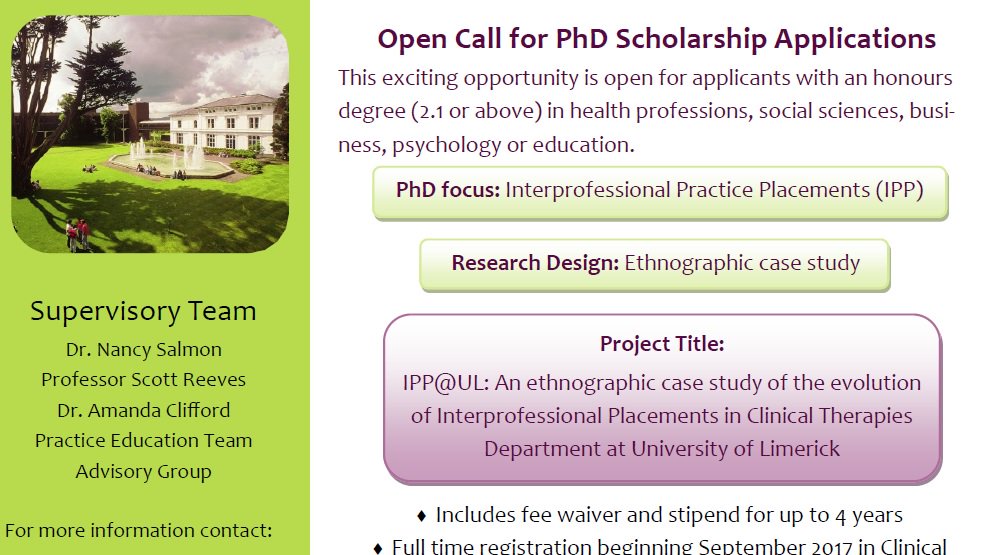 Interprofessional PhD scholarship opportunity, Univ of Limerick (JIC Editor on supervisory team). Details at: http://www.ul.ie/graduateschool/course/structured-phd-clinical-therapies …pic.twitter.com/Tsx5bkgpPi