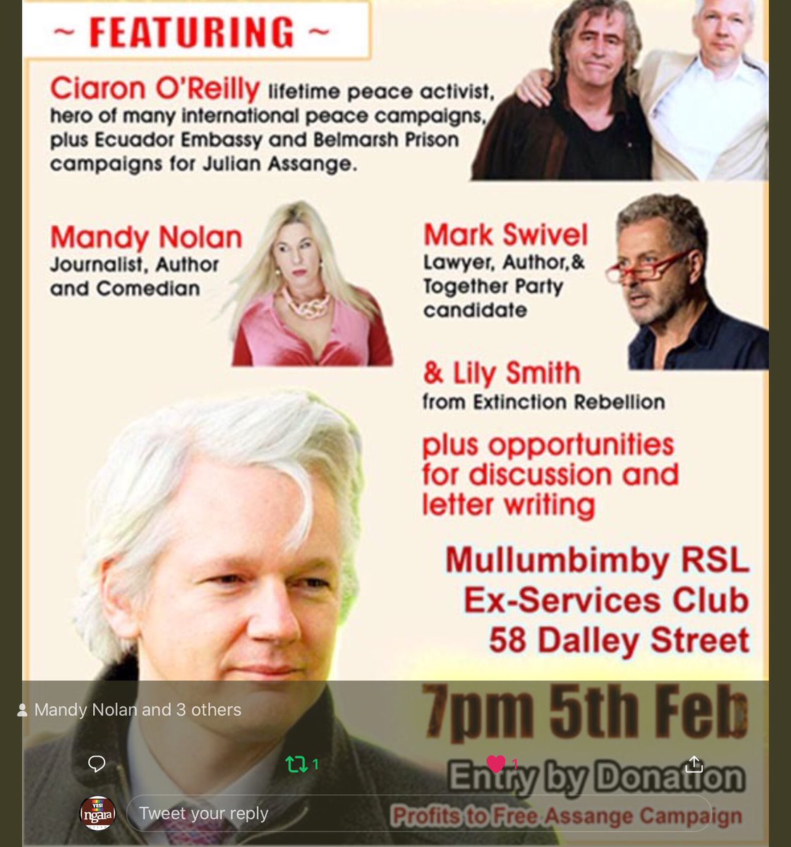 #Assange Support group will hold a public meeting at the Mullumbimby RSL on February 5 with speakers who include the Catholic Worker Ciaron O’Reilly and comedian Mandy Nolan, lawyer Mark Swivel and Lily Smith from Extinction Rebellion.pic.twitter.com/nkWaYrJXIq