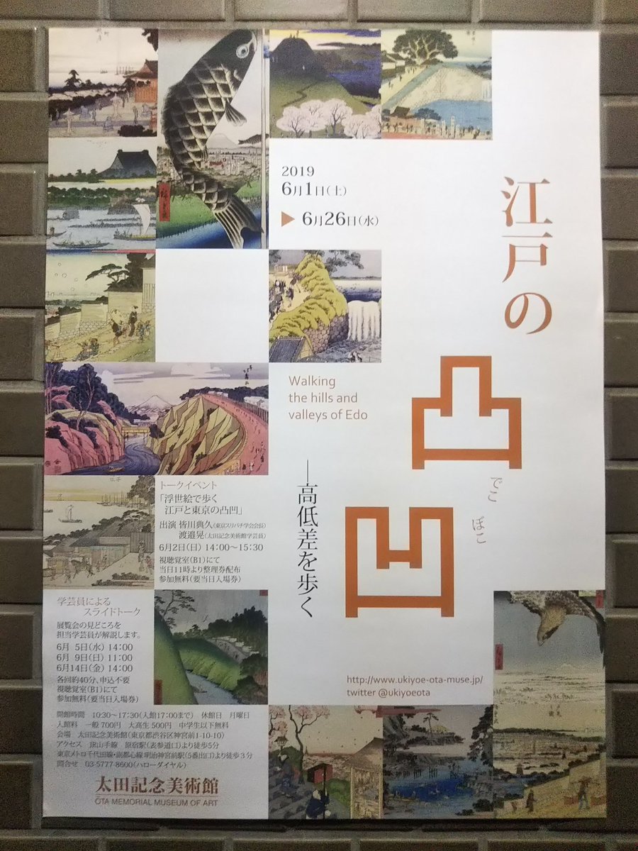 太田記念美術館で「江戸の凸凹」。見慣れた浮世絵も、視点を変えると(そして量を集めると)新鮮な驚きを生む。武蔵野台地と東の低地に川や谷、高低差都市・江戸の風景が実におもしろい。高低のキワが、行楽や遊興、信仰の場だったのがよくわかる。東京の地形、坂、高低差にときめいてしまう人、必見。pic.twitter.com/O5r8VEUMvO