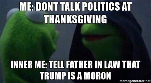 The idea that you shouldn't talk politics is wrong. If you family has shitty politics don't show up. You are not obligated to spend time with horrible people. If they are upset, cite that they voted for a piece of shit and you can't support that.https://twitter.com/ArmyUte/status/933511612270383104 …